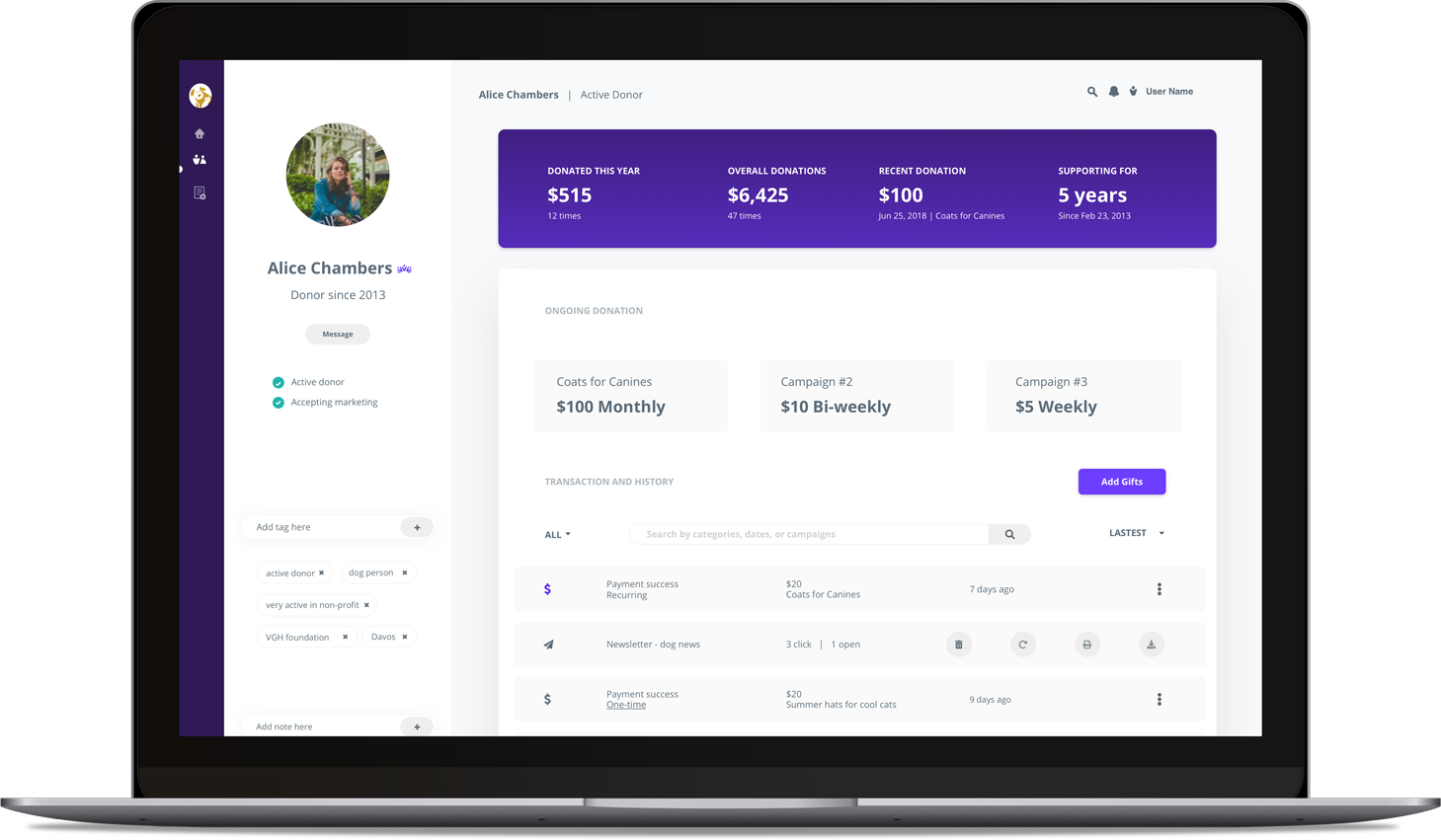 Send thank you messages, create tags and notes, and get full insight into giving history. We make it easy for you to really get to know your donors and build lasting relationships.